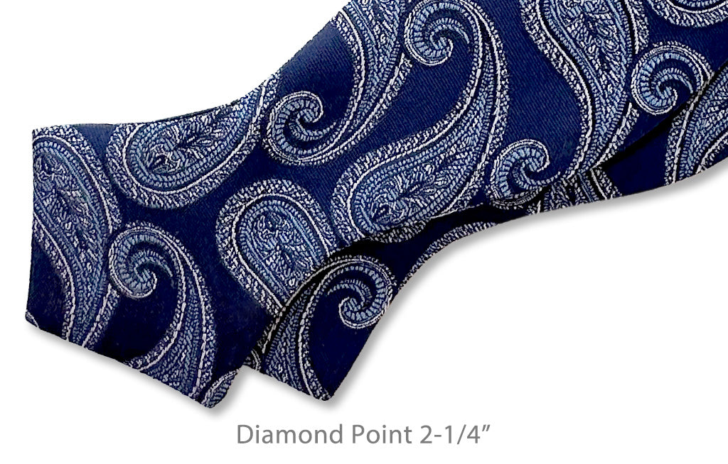 ![]() | Diamond Point 2-3/4” The pointed end is on one side of the front panel and on the opposite side of the back panel when tied. A very popular shape as well. The asymmetric look gives the bow tie and pattern a sense of movement, but still maintains visual balance. Dimension: 4-5/8"W x 2-3/4"H |