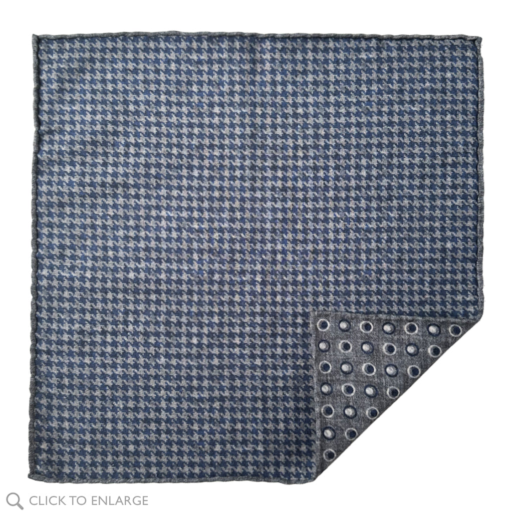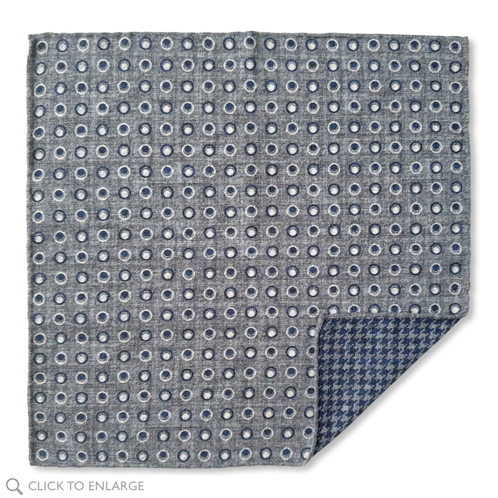 Two colors, two sides, two fabrics make this reversible pocket square the perfect finishing touch to any attire! One side is a lively set of ovals whereas the other is a tried and true houndstooth, both in navy and grey that will compliment your outfit oh so well.