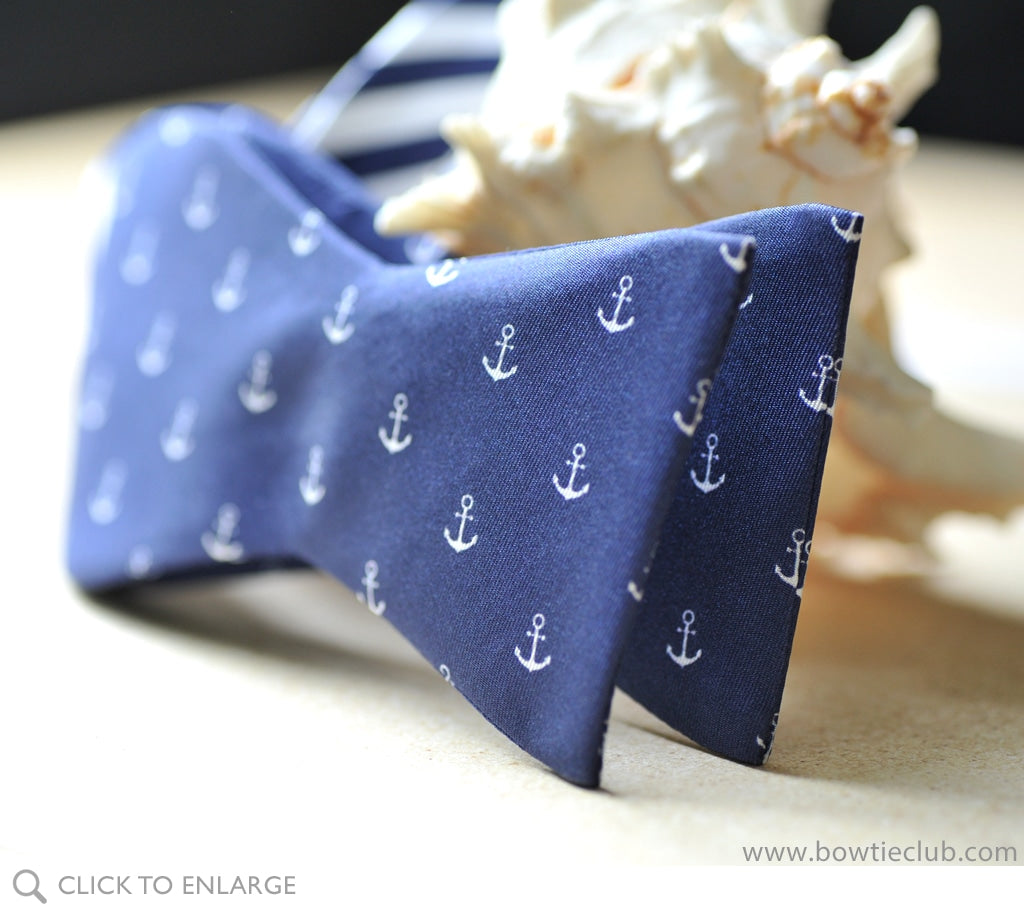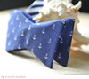 A beautiful nautical anchor themed bow tie for lovers of the sea. What sets it apart from other sailing motif bow ties is the way we design and print the pattern. You can see from the untied picture that the back half and neckband is printed as a navy and white stripe, the front bow part is navy with white anchors. This is totally unique in the bow tie industry and shows the extra effort we put into each and every bow tie we sell. Design matters and this one is the perfect blending of stripes and solids complementing each other so well! Anchors away and set sail with the Blue Anchor bow tie today.