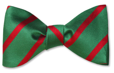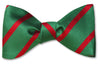 A Christmas bow tie that can be worn year round, now that is unique and incredibly useful! Brightly adorned in red stripes on a striking green backdrop.