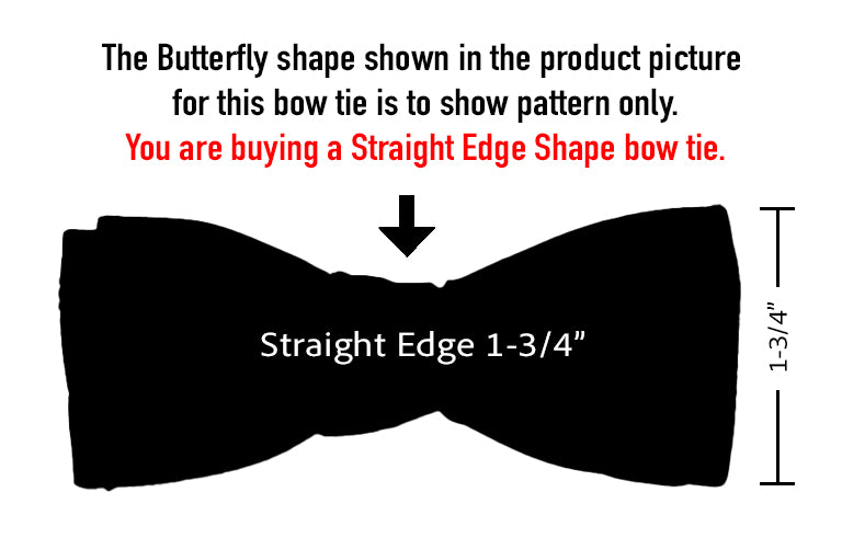![]() | Butterfly 2-1/4” A slightly smaller medium sized butterfly. This is the size of butterfly found in many men's retailers. The butterfly is by far the most popular shape of bow tie and has room to show off the pattern. If you like your bow tie in the medium to small size range then this is the bow tie for you. Dimension: 4"W x 2-1/4"H |
