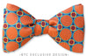 Orbicular Splendor presented in circles of Bronze, brown, yellow and teal on royal blue. Our Ronda Bow Tie will be an instant hit from day one!