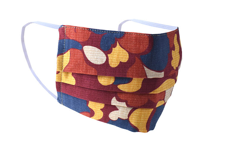 • Large swaths of burgundy, brown, gold and navy in a beautiful flowing design with an underlying subtle chevron pattern.  A unique and artistic cotton face mask that will add impact to your daily attire.
