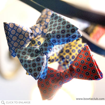 Classic bow tie designs like this Italian printed silk medallion pattern are universally pleasing and can be paired with anything. The blue and white design on light blue is especially soothing and will brighten up any look!